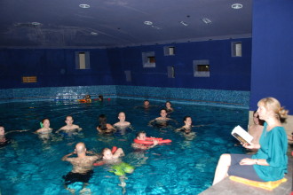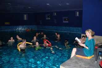 Der gesprochene Text wird mit Lautsprechern über und unter Wasser übertragen.